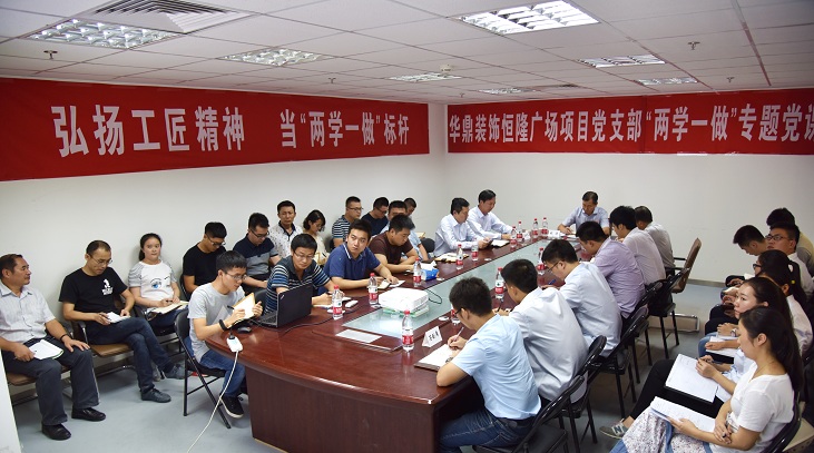 作为集团领导的工作联系点,张总对华鼎装饰以及恒隆广场精装修项目给予高度重视。在党课讲话中,他首先从一线开展“两学一做”学习教育的重要性、学习教育的范围、学习内容、学习教育方法和目的等方面做了专项辅导,引导党员坚定理想信念,提高党性觉悟,形成精神武装。就如何立足岗位开展“两学一做”学习教育时指出:一是要加强项目党支部组织建设。开展学习教育要找准工作着力点,调动人员积极性,党员要勇于担当,思想行动上都要以合格党员的标准严格要求;二是项目党支部要带领广大党员立足岗位强管理做标杆。要充分发挥好党员的组织协调能力和榜样带动力量,调动工作主观能动性,打造坚实有力的团队合力。三是要强化项目履约管控,把“两学一做”的学习成效落实在项目施工实际,创新创效,打造品牌形象。四是要深入学习“两条例一准则”,教育党员做到守纪律讲规矩,实现工程优质、干部优秀的管理目标。同时,张总在讲课中结合“两学一做”学习和贯彻落实集团年中会议精神,针对华鼎装饰创新发展提出要抓住战略发展机遇、找准发展定位、提升精细化管理水平等,在创新品牌上做文章、在职工幸福指数上再提高、在人均产出和差异化上出成就、在海外项目拓展上下力气。