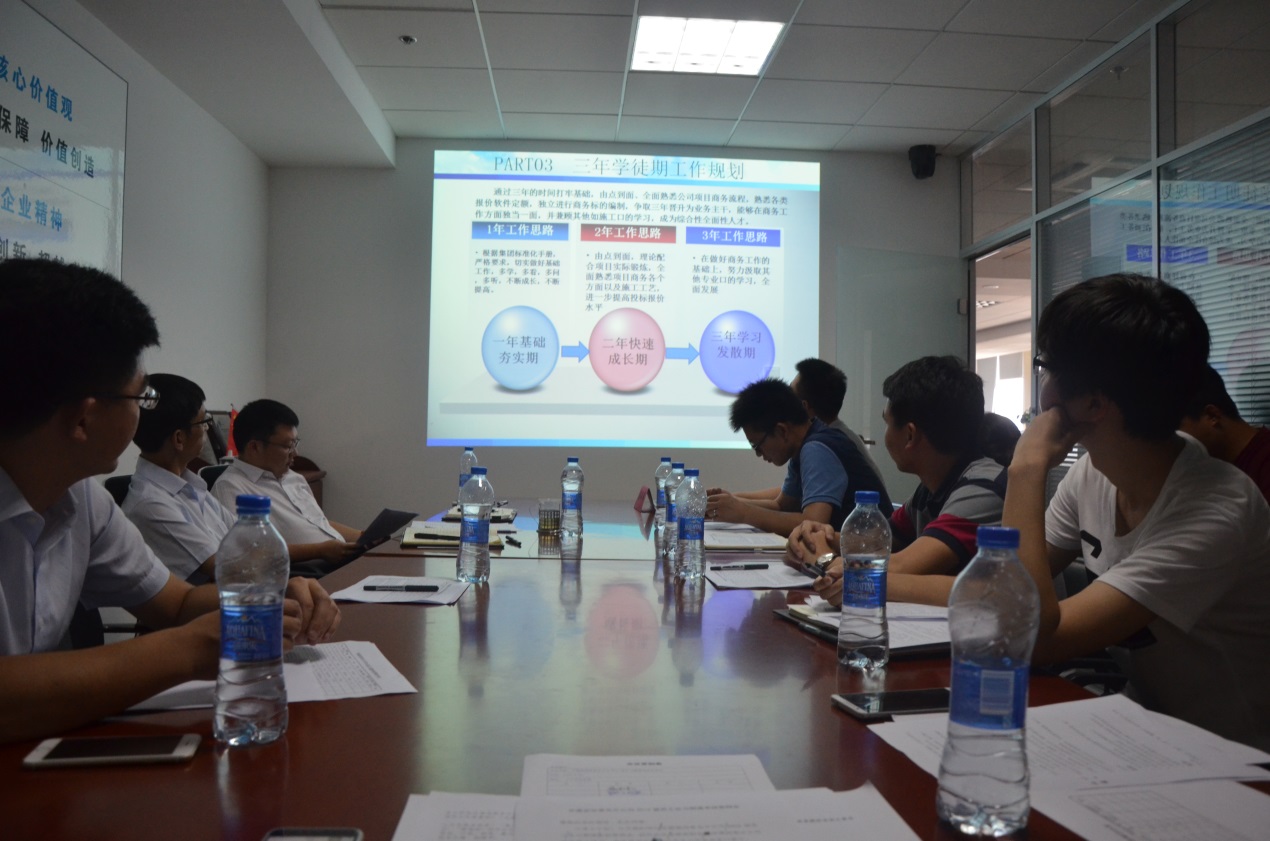 为科学有效的检验人才阶段性成长,发掘人才、培养人才,8月22日,青岛分公司举办了2015届见习人员转正答辩会。分公司执行经理樊继潮,副经理马强,以及分公司优秀项目经理、各部门业务骨干担任此次答辩评委,答辩会由办公室人力资源主持。